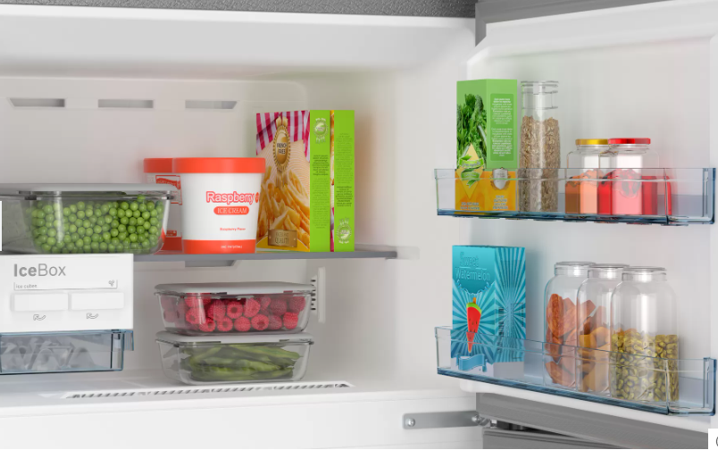 this refrigerator offers ample storage space for groceries, beverages, fruits,