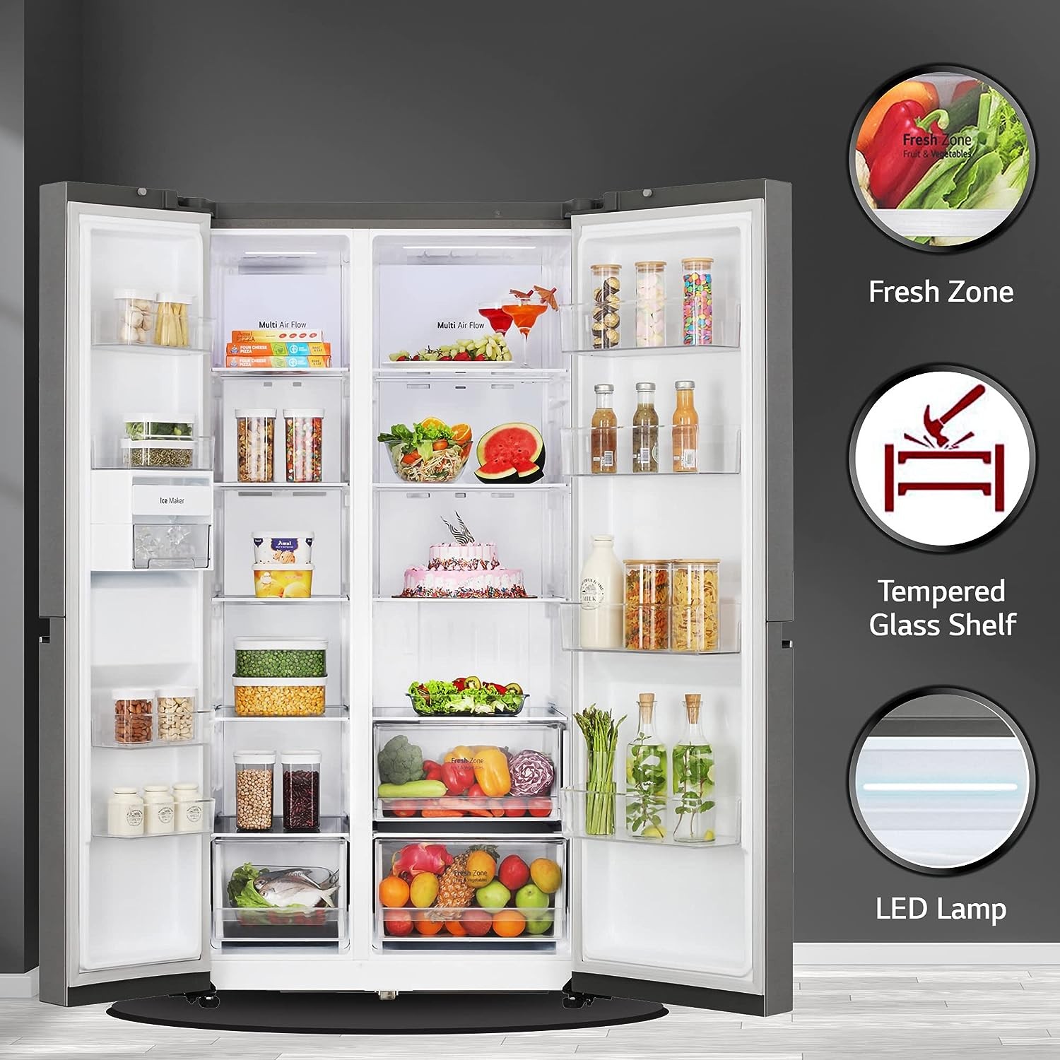 655 liters, this side by side refrigerator offers ample space for storing